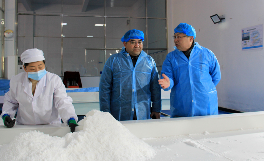 楊龍察看了金橋制鹽公司雪花鹽車間、加工鹽車間、包裝鹽車間生產現場,詳細了解企業(yè)近期的產品生產銷售情況,要求該公司要繼續(xù)抓好疫情防控、產品市場開拓和冬季安全生產工作。