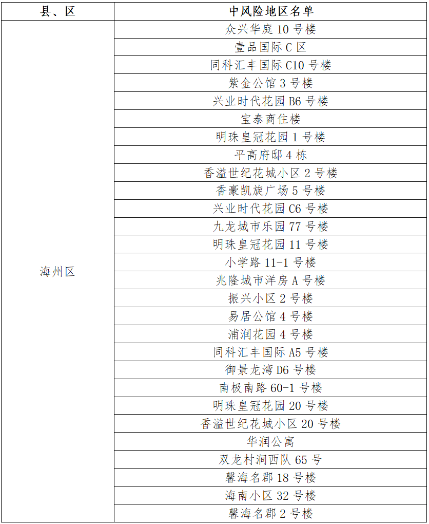 根據(jù)國務(wù)院聯(lián)防聯(lián)控機制有關(guān)規(guī)定,經(jīng)市指揮部研究決定,自發(fā)布之日起,對我市部分區(qū)域疫情風(fēng)險等級進行調(diào)整:海州區(qū)天順國際花園7號樓、鳳凰名都10號樓、御景龍灣C1號樓、天順國際花園11號樓、御景龍灣A4號樓、香溢江南小區(qū)12號樓、同科匯豐國際A2號樓、平高書香名邸1號樓、香溢江南小區(qū)7號樓、西門村楊鳳莊21號、鳳凰名都9號樓、園林村白虎山小區(qū)78號樓、江化北路82-5號、金色大漠、平高書香名邸4號樓、朐陽街道花園路1號、制藥巷5-114、萬潤泰和苑4號樓由中風(fēng)險地區(qū)調(diào)整為低風(fēng)險地區(qū)。其他地區(qū)風(fēng)險等級不變。調(diào)整后全市現(xiàn)有28個中風(fēng)險地區(qū)。