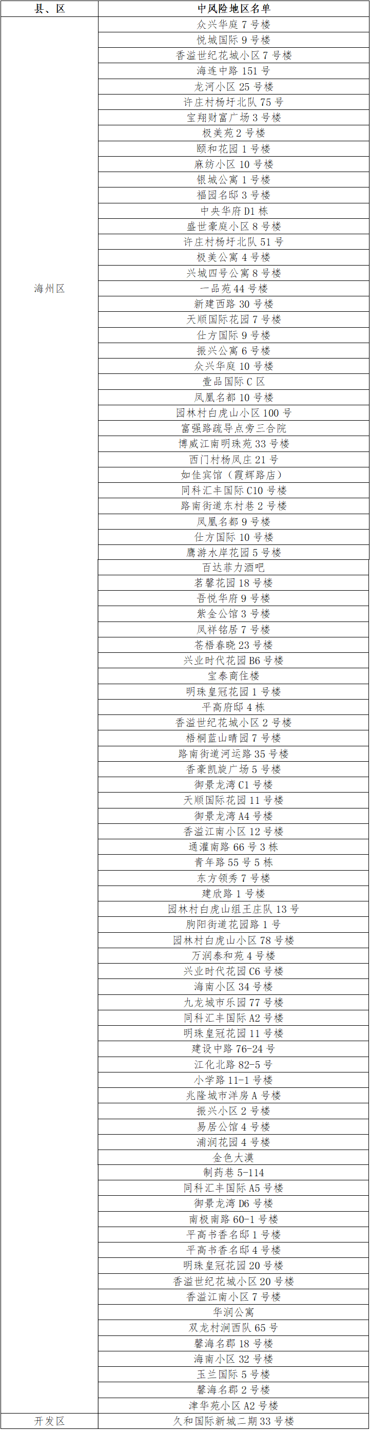 根據(jù)國務(wù)院聯(lián)防聯(lián)控機制有關(guān)規(guī)定,經(jīng)市指揮部研究決定,自發(fā)布之日起,對我市部分區(qū)域疫情風(fēng)險等級進(jìn)行調(diào)整:海州區(qū)九嶺社區(qū)北大荒西21號由中風(fēng)險地區(qū)調(diào)整為低風(fēng)險地區(qū)。其他地區(qū)風(fēng)險等級不變。調(diào)整后全市現(xiàn)有91個中風(fēng)險地區(qū)。 連云港市中風(fēng)險地區(qū)(91個)