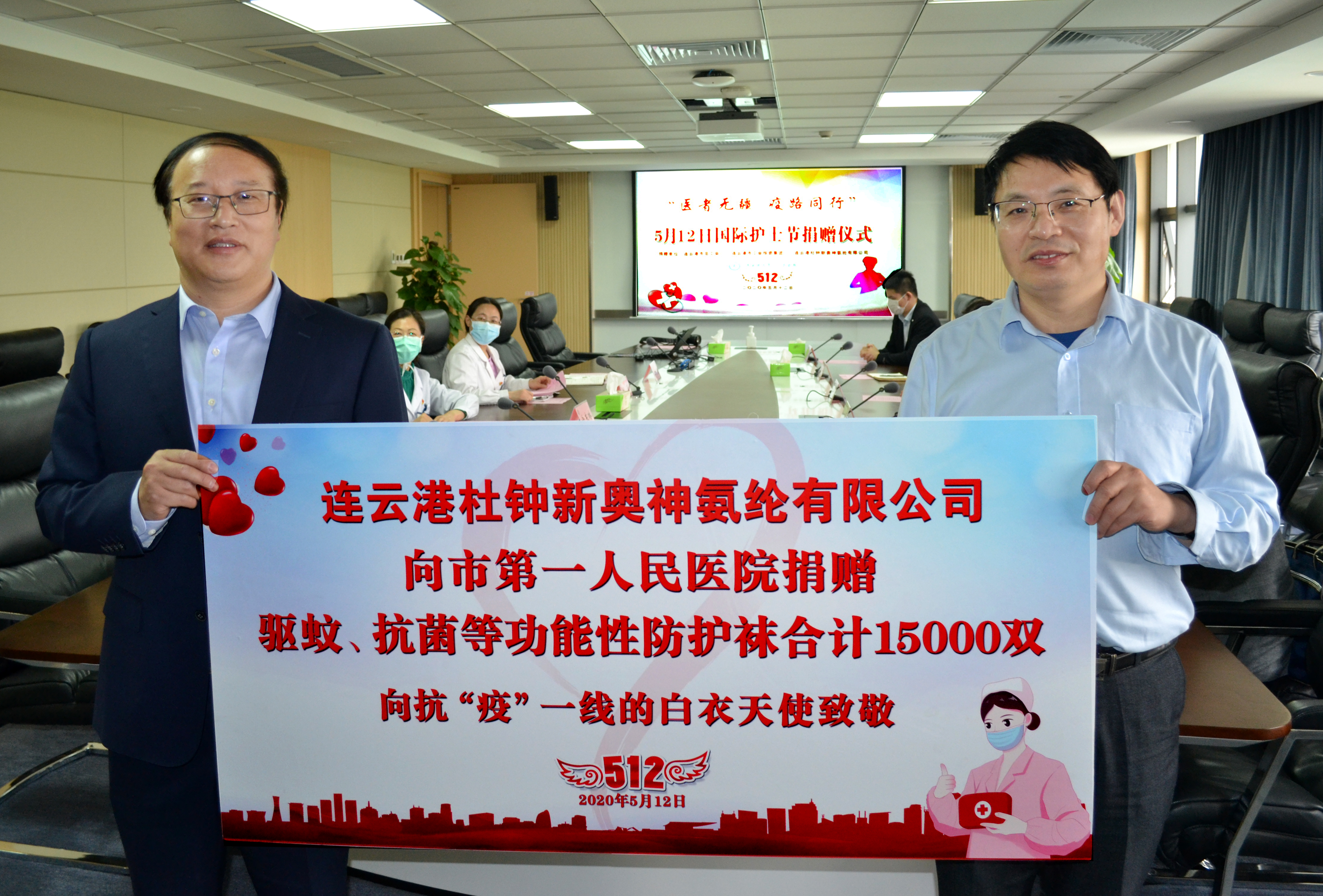 5月12日國(guó)際護(hù)士節(jié),連云港杜鐘氨綸有限公司來到連云港市第一人民醫(yī)院開展愛心捐贈(zèng)活動(dòng),共計(jì)捐贈(zèng)功能性絲襪15000雙。市總工會(huì)副主席秦云、集團(tuán)工會(huì)主席劉承志、市一醫(yī)工會(huì)主席胡蓉,副院長(zhǎng)李明星,氨綸公司總經(jīng)理張斌出席捐贈(zèng)儀式。
