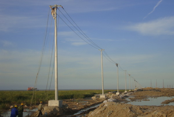連云新城三期供電線路緊貼海堤邊。受海堤建設進度和海風海潮的影響,低矮的壩堤經(jīng)常被風刮起的海浪浸頂,石塊突起,洼水漣漪,淤泥纏足,堤邊路面凹凸不平,道路僅限一輛車通行,擁擠不堪,工程施工難度極大。為提升速度,加快進度,臺北供電所克服困難,緊鑼密鼓地展開工作,以期早日完工?,F(xiàn)場勘察地形地貌,了解潮汐運動規(guī)律,制定施工計劃,設計措施方案,組織人力,采購材料,投入施工。施工人員采用彈性工作時間,利用落潮時機,搶運電桿,及時立桿和裝配。職工們發(fā)揚不怕苦,不畏難的精神,不懼海風吹臉、海水浸衣,爬上距離海平面二十多米仿佛搖擺不定的高桿,懸在空中一絲不茍地操作,保障了工程的全面竣工。