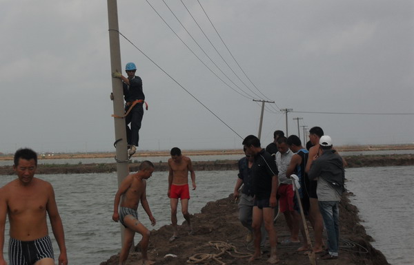 8月2日21時30分,“達(dá)維”在鹽城陳家港鎮(zhèn)登陸,帶來狂風(fēng)暴雨。所轄供電范圍比鄰陳家港鎮(zhèn),臺風(fēng)造成電力設(shè)施損壞,多條10KV線路停電。該所啟動重大氣象災(zāi)害應(yīng)急預(yù)案,全所職工在崗待命搶修, 8月3日凌晨3時30分有全部到崗工作。4時,職工分頭對線路進(jìn)行巡視檢查,在第一時間發(fā)現(xiàn)故障點(diǎn),以便搶修。該所主要領(lǐng)導(dǎo)主動與重要客戶聯(lián)系,及時掌握情況,組織人員搶修。廣大搶修職工不怕困難,不怕疲勞連續(xù)作戰(zhàn),盡快恢復(fù)和保證生產(chǎn)生活用電,發(fā)揮了供電人特別能戰(zhàn)斗的精神。由于電桿倒在水中,給立桿帶來了困難,大家主動脫去衣服,跳入到半腰身的水中搶修,有的解線,有的打拉線,個個干得一身汗,一身泥。