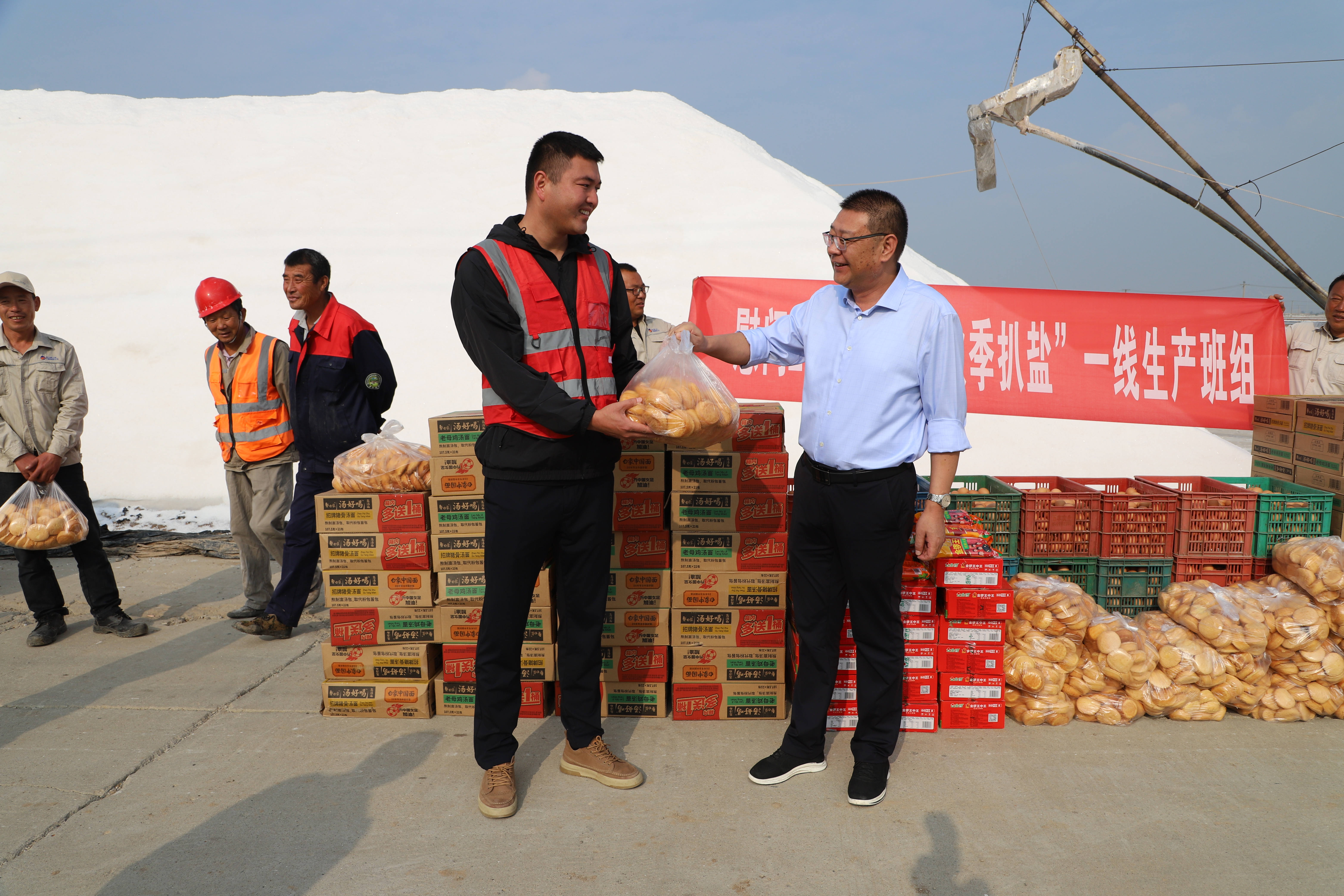 “你們辛苦了,我代表公司來看望大家?!痹谛潞游灏?,孫政權(quán)與扒鹽現(xiàn)場職工握手問好,感謝他們?yōu)槿諘裰汽}公司的原鹽生產(chǎn)所付出的辛勤努力,叮囑他們要落實落細扒鹽安全生產(chǎn)措施,并送上雞蛋、方便面、火腿腸、雞蛋糕等物品。