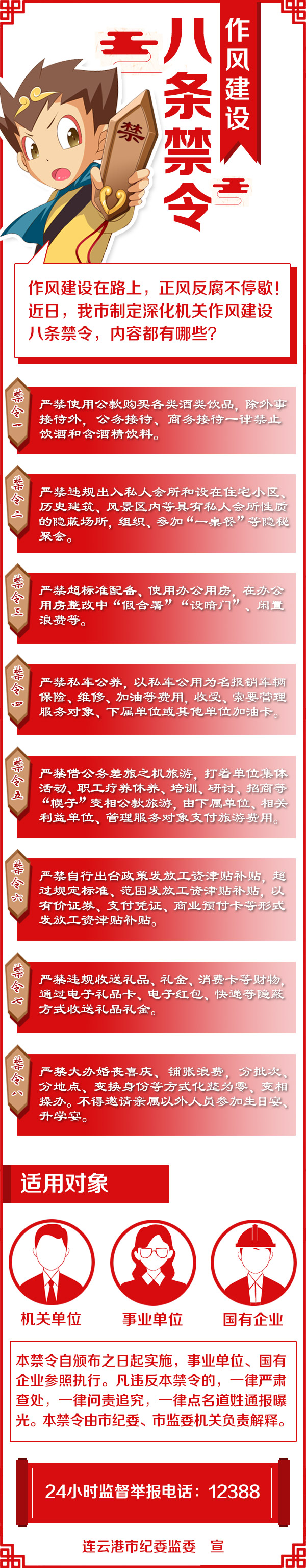 本禁令自頒布之日起實施,事業(yè)單位、國有企業(yè)參照執(zhí)行。凡違反本禁令的,一律嚴(yán)肅查處,一律問責(zé)追究,一律點名道姓通報曝光。本禁令由市紀(jì)委、市監(jiān)委機關(guān)負(fù)責(zé)解釋。24小時監(jiān)督舉報電話:12388。