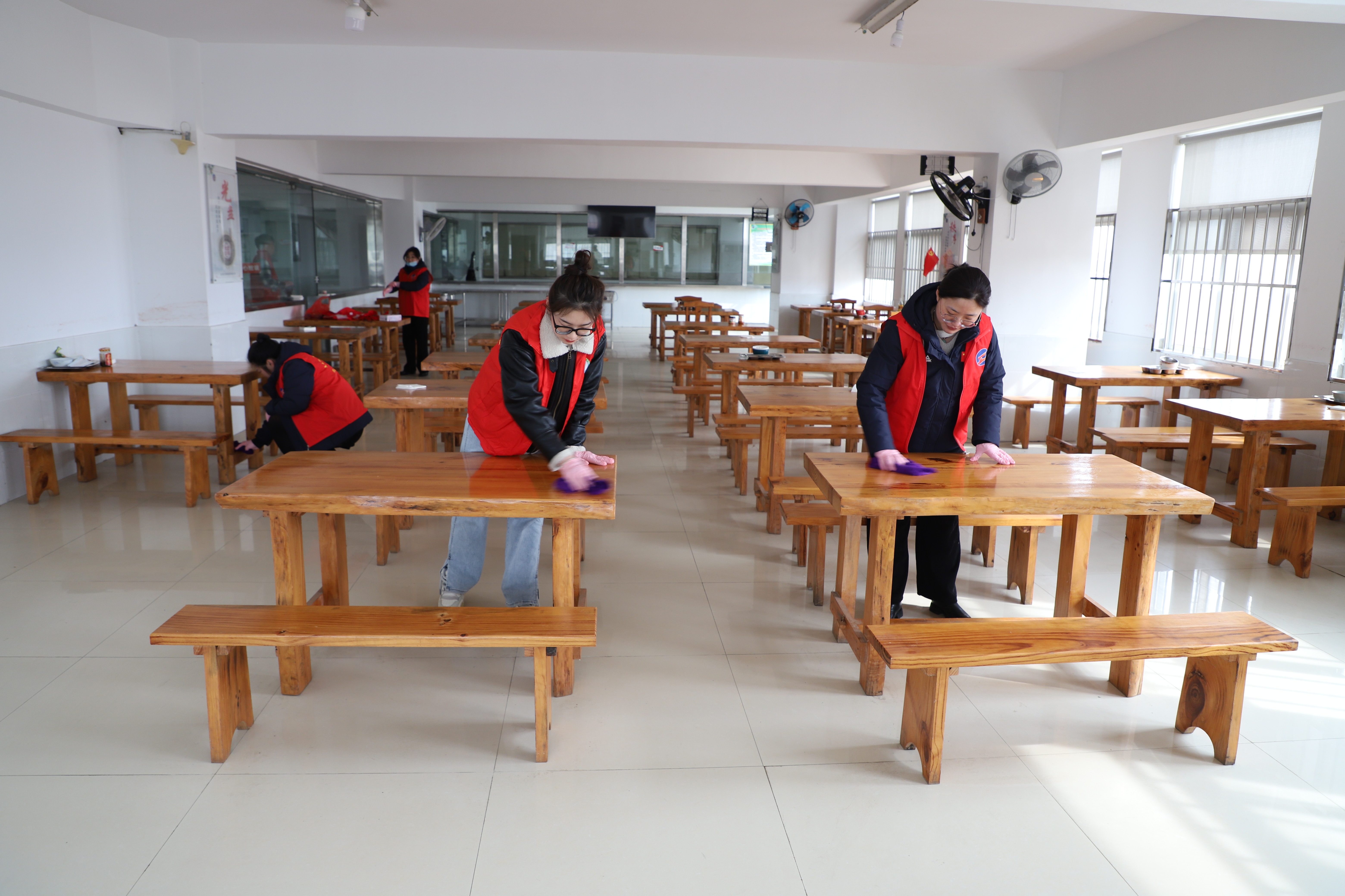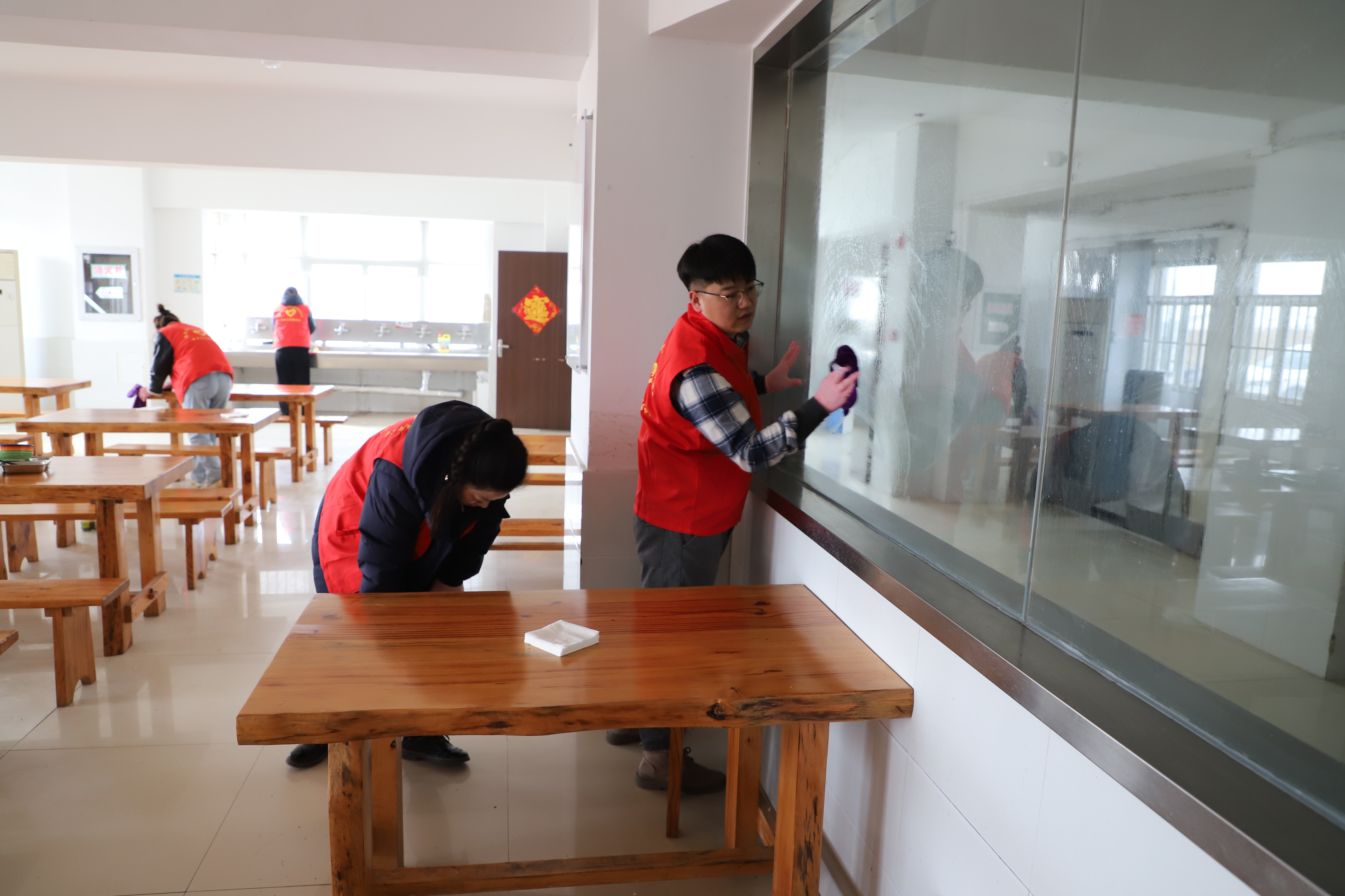 在食堂里隨處可見的志愿者兢兢業(yè)業(yè)的忙碌著,他們不怕臟,不怕累,不遺漏任何衛(wèi)生死角,他們分工合作,有的擦窗,有的抹地,有的清掃垃圾,干勁十足,呈現出一派熱火朝天的勞動場面。經過兩個小時的辛勤勞動,食堂環(huán)境煥然一新。(西團)