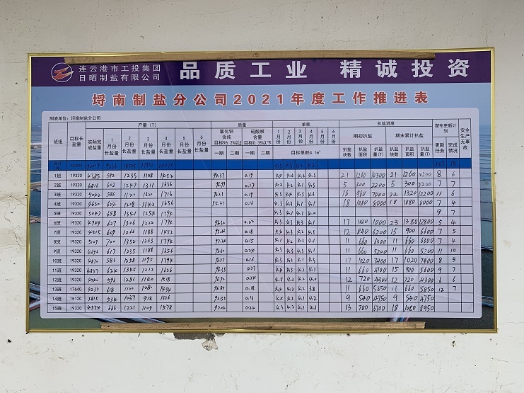 張貼二季度工作推進(jìn)表,清晰的反映出目前的原鹽產(chǎn)量、質(zhì)量、單耗、以及春季扒鹽情況。分公司經(jīng)理程龍要求各個(gè)片區(qū)負(fù)責(zé)人按照表上反映的數(shù)據(jù),查漏補(bǔ)缺,強(qiáng)化生產(chǎn)工作。在提高單產(chǎn)、降低單耗上下功夫,強(qiáng)化“三雨操作”,加強(qiáng)結(jié)晶管理,嚴(yán)格除硫生產(chǎn)工藝,充分利用粉鹽化鹵,下馬格、副廩基等有效面積窮制鹵水,最大限度地降低鹵耗,提高單產(chǎn),加快扒鹽進(jìn)度、強(qiáng)化扒鹽產(chǎn)量、保證安全工作。