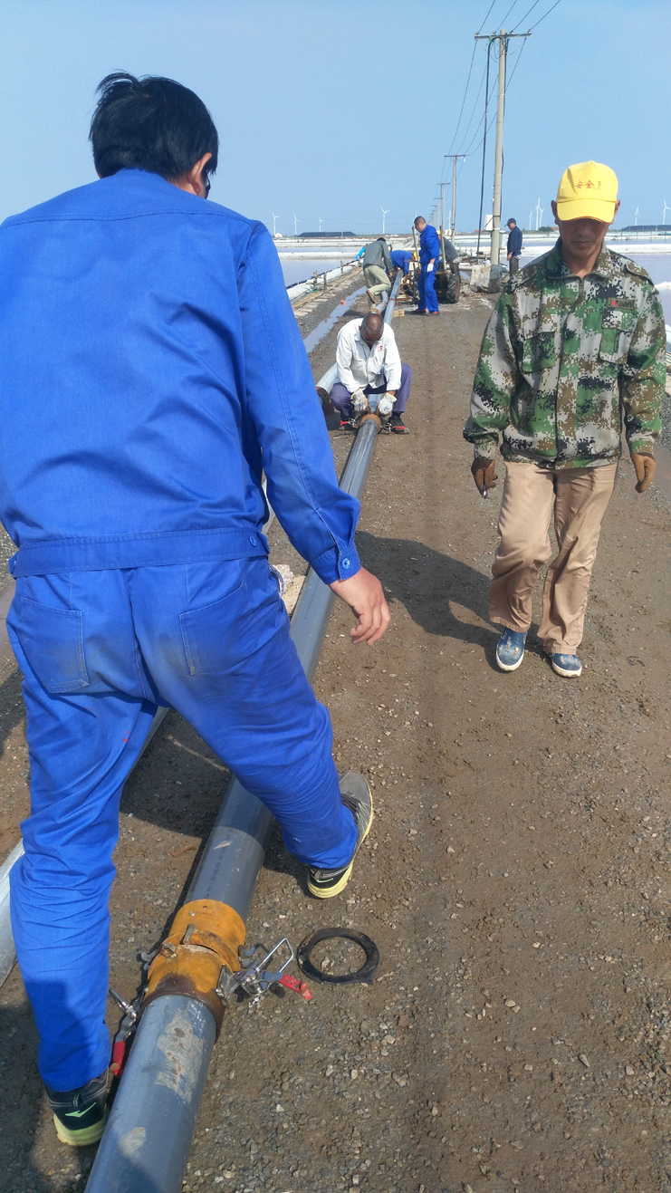 為節(jié)省扒鹽管道拆、裝時(shí)間,提高扒鹽速度,減輕扒鹽人員負(fù)荷,6月11日上午機(jī)電服務(wù)公司新制快接管道在埒南制鹽公司11班進(jìn)行現(xiàn)場實(shí)踐。他們放棄休息日,制作人員全員參與,市勞模王緒華、一星級員工程洪連、黨員楊軍,他們個(gè)個(gè)不怕臟和累,經(jīng)過一個(gè)多小時(shí)操作,管道安裝結(jié)束,在幾次調(diào)試后,扒鹽機(jī)組運(yùn)行正常。該快速接頭優(yōu)點(diǎn)是安裝、拆解快捷,節(jié)約成本,不足是皮墊易漏鹵。通過此次試運(yùn)行,對不足之處,該公司將繼續(xù)研究,爭取早日投入鹽業(yè)生產(chǎn),創(chuàng)造效益。(機(jī)電服務(wù)公司)