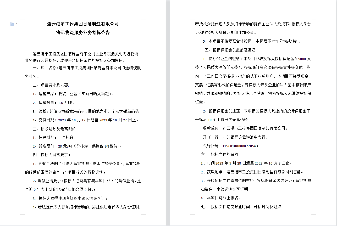 連云港市工投集團日曬制鹽有限公司海運物流服務(wù)業(yè)務(wù)招標公告