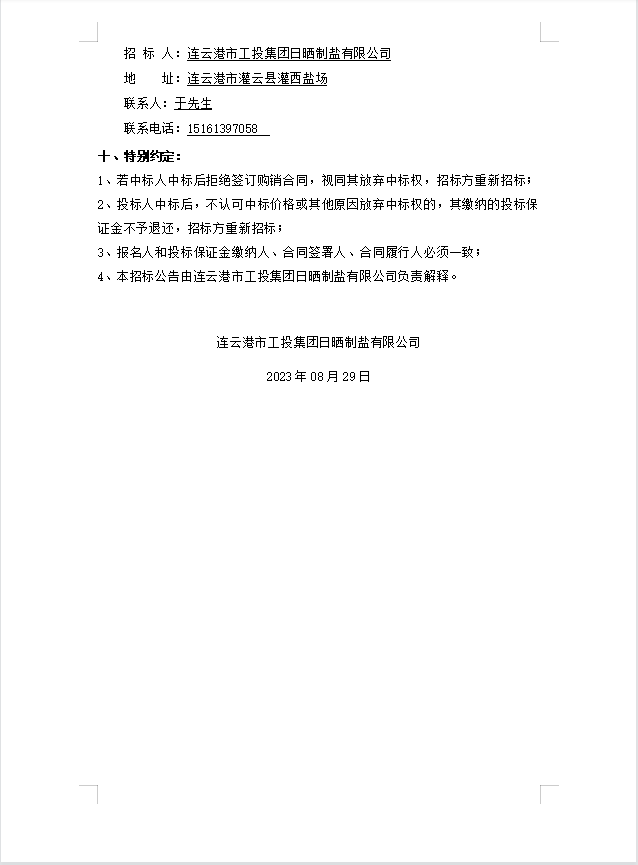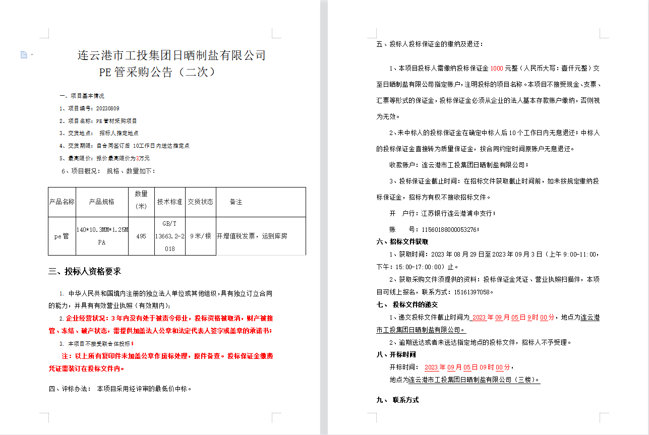 連云港市工投集團(tuán)日曬制鹽有限公司PE管采購公告(二次)