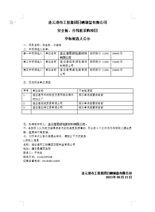 連云港市工投集團(tuán)日曬制鹽有限公司 安全板、分線樁采購項目 中標(biāo)候選人公示