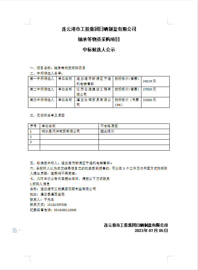 連云港市工投集團日曬制鹽有限公司軸承等物資采購項目中標(biāo)候選人公示