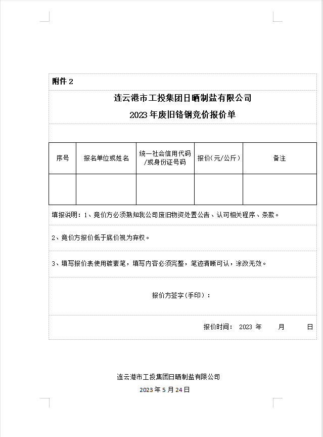 連云港市工投集團(tuán)日曬制鹽有限公司廢舊鉻鋼處置公告