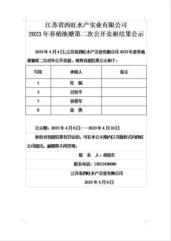 江蘇省西旺水產(chǎn)實業(yè)有限公司2023年養(yǎng)殖池塘第二次公開競租結果公示