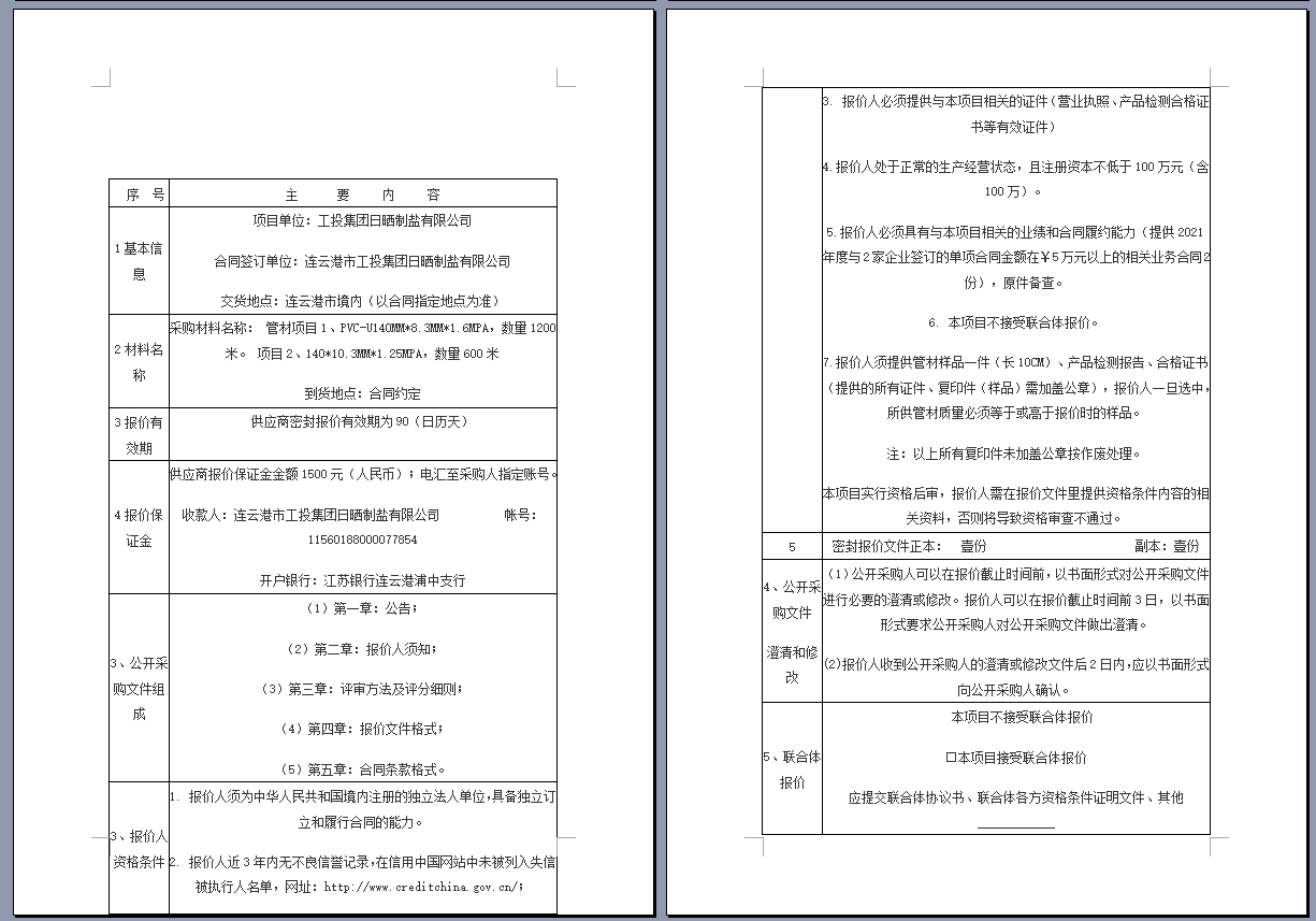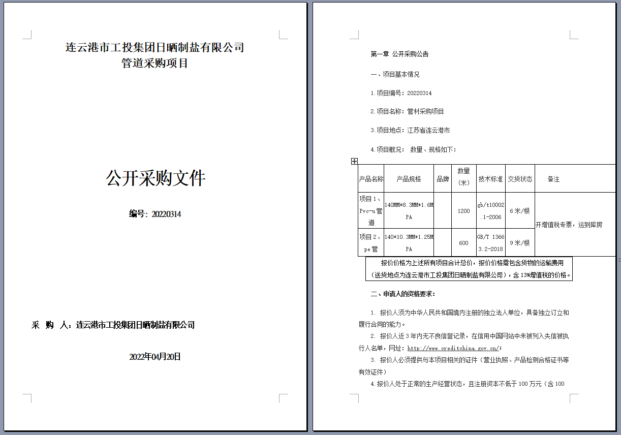 連云港市工投集團(tuán)日曬制鹽有限公司管道采購(gòu)項(xiàng)目 公開采購(gòu)文件