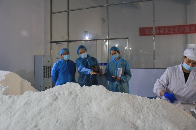 檢查組一行查看了公司相關(guān)臺賬資料,實(shí)地查看了加工鹽車間、包裝鹽車間、雪花鹽車間、化驗(yàn)室等;檢查組一行對我公司食品安全管理工作給予肯定,并對下一步隱患排查整改工作提出了意見和建議。