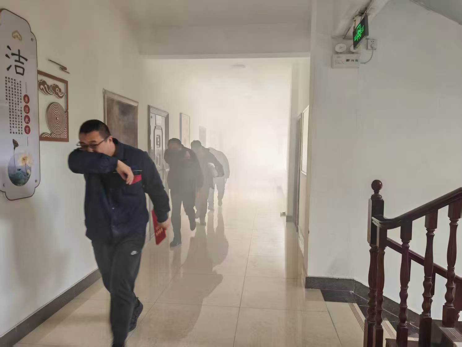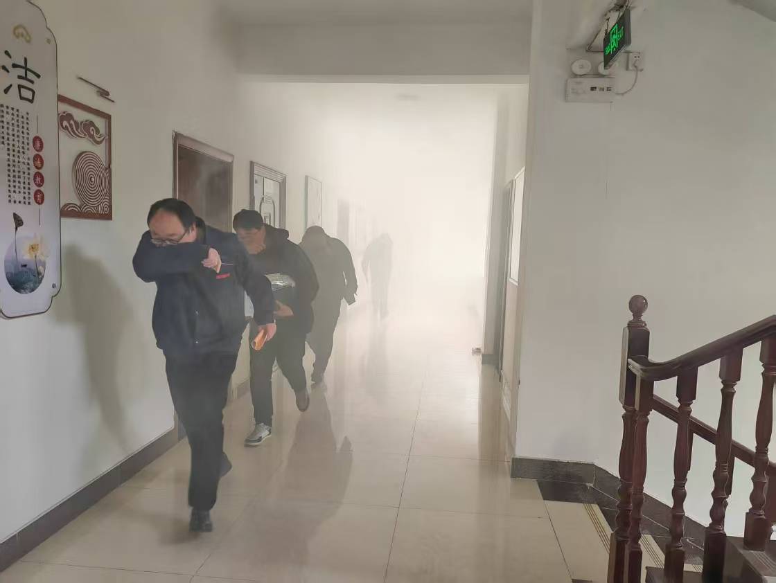 疏散演習(xí)開始后,全體人員迅速做出反應(yīng),在現(xiàn)場(chǎng)引導(dǎo)員的指揮下,按照預(yù)定的疏散路線,捂住口鼻,低姿彎腰,有序地向指定的安全區(qū)域撤離。