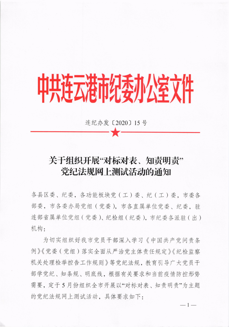 關(guān)于組織開展“對標(biāo)對表、知責(zé)明責(zé)”黨紀(jì)法規(guī)網(wǎng)上測試活動的通知