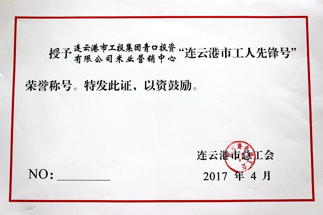 近日,公司米業(yè)營銷中心在連云港市總工會(huì)組織的 “2017年度連云港市工人先鋒號(hào)”評(píng)選活動(dòng)中,被授予“工人先鋒號(hào)”榮譽(yù)稱號(hào)。