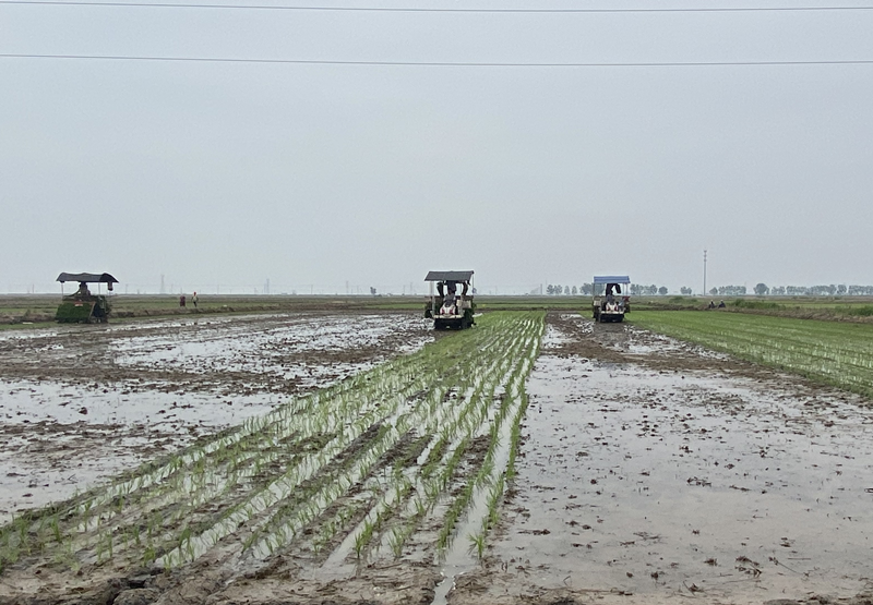 走進(jìn)大新農(nóng)場(chǎng)田間地頭,伴隨著機(jī)械轟鳴聲,插秧機(jī)往來穿梭,一株株嫩綠的秧苗在插秧機(jī)苗盤上滑落,整齊地插入水田里。