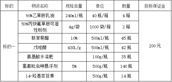 3.原則上由投標單位按貨物需求進行投標,若規(guī)格不符,投標單位也可以根據(jù)自有包裝規(guī)格進行投標。本次招標采購,確定生產(chǎn)廠家或代理商、農(nóng)藥品種、規(guī)格、劑型和農(nóng)藥單價。