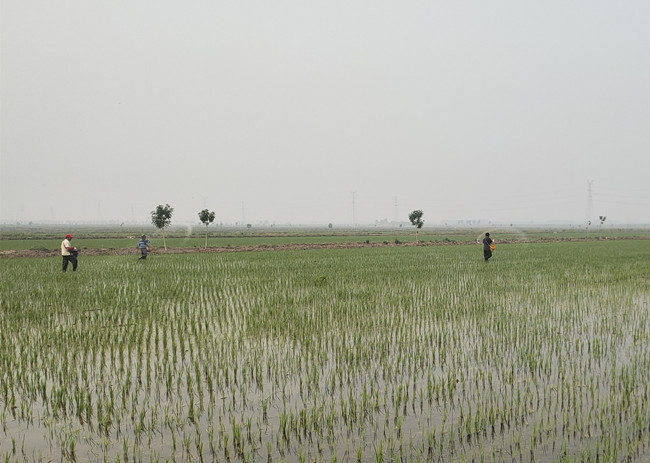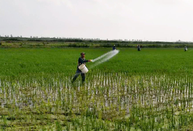 (對秧苗進(jìn)行撒施分蘗肥)