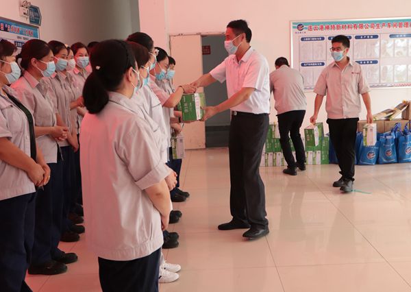 陳總向高溫下堅(jiān)守崗位的一線職工進(jìn)行慰問,細(xì)心叮囑要認(rèn)真做好防暑降溫和疫情防控工作,并送上綠豆、大米等防暑降溫慰問品,為在炎炎夏日堅(jiān)守一線的職工送來一份清涼,帶來一片關(guān)懷。(神特宣)