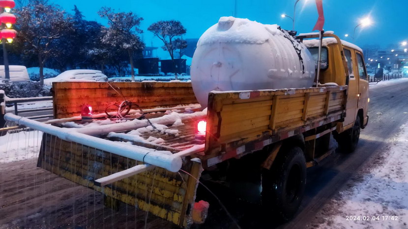? ? ? ? 今天(2月4日),港城普降暴雪,臺北華茂全員出動500余人次,大小機械100余臺(班),全力確保了轄區(qū)交通線暢通。這中間,出現(xiàn)一臺除雪“核武器”,這就是翔立分公司自制的鈣液噴淋除雪車。