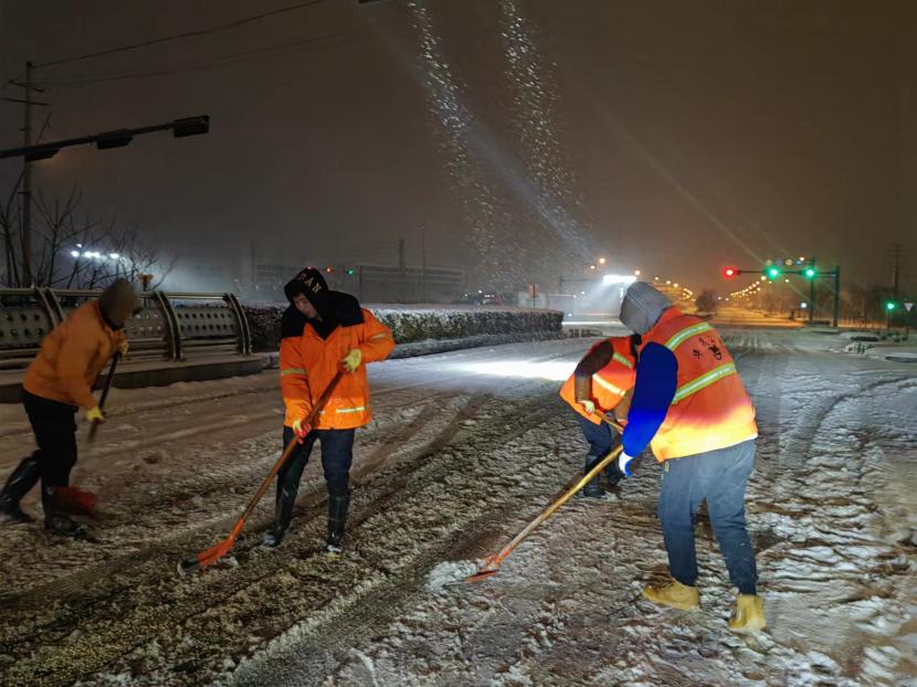 上午10時(shí)許,暴雪如約而至。裝有融雪劑的車輛全部整裝待發(fā),聞令而動(dòng),采取“人工+機(jī)械”不間斷作業(yè)模式,對(duì)轄區(qū)主次干道、橋涵、火車站東站、創(chuàng)智大廈等帶坡路段及時(shí)拋撒融雪劑,采取“滾刷+鏟車”組合方式,反復(fù)排掃路面積雪,確保主次干道、帶坡路段通暢無冰。