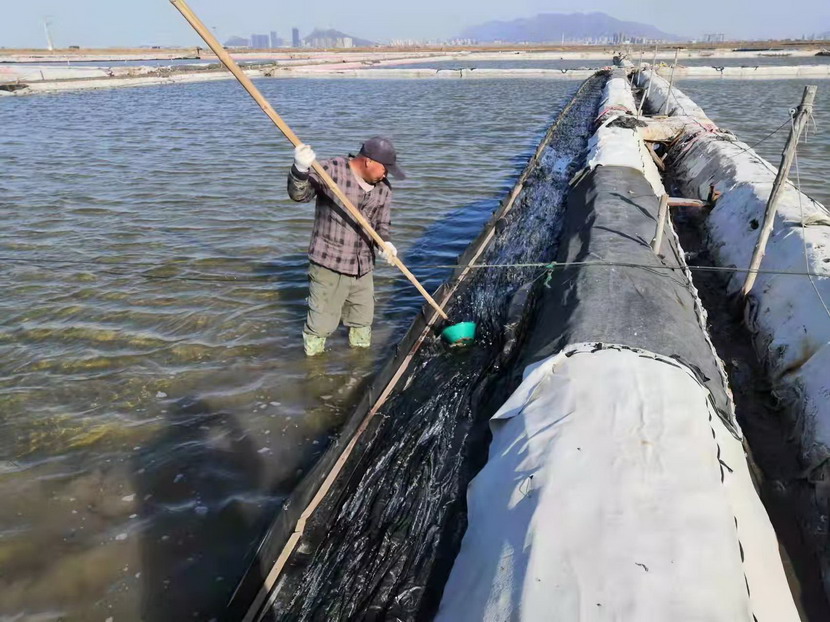 2021年,他服從公司生產(chǎn)機(jī)制的轉(zhuǎn)換,被安排到海濱三組18號灘作為領(lǐng)灘手,負(fù)責(zé)鈣液生產(chǎn)。為了不浪費(fèi)每一毫米的蒸發(fā)量,每天天剛蒙蒙亮,就能看見他在縱橫阡陌的鹽田間穿梭,根據(jù)灘田結(jié)構(gòu)、針對不同季節(jié)確定走水路線,每天重復(fù)著調(diào)節(jié)鈣液、修整溝堰、修補(bǔ)塑布的工作,遇到大雨,他就不回家,守在灘上,及時(shí)把鈣液按照不同濃度引進(jìn)鹵臺、鹵窖,雨水結(jié)束,第一時(shí)間把灘面淡水排掉,將鈣液回引進(jìn)行晾曬。在生產(chǎn)面積僅有311畝的情況下,他每天要走3萬-4萬步,不僅對他自己的生產(chǎn)單元,對整片鈣液生產(chǎn)單元了如指掌,有多少閘門,多少電線桿,都了然于心。全年下來,生產(chǎn)鈣液28000方,在12個(gè)鈣液生產(chǎn)單元中名列前茅,領(lǐng)先超9000方,實(shí)至名歸的生產(chǎn)標(biāo)兵。