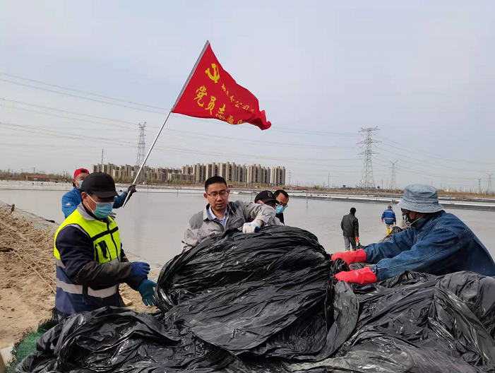 生產(chǎn)現(xiàn)場,一面面紅旗迎風(fēng)招展,先鋒班組組長沈秀成駕駛拖拉機(jī),載著塑布在壟道上來回穿梭,蕩起滾滾煙塵;兩大虎將劉天義、徐勇率領(lǐng)后勤人員將塑布卸到指定單元;退休黨員朱春年帶領(lǐng)兩個(gè)小組成員蹚進(jìn)鹽池,將塑布上肩分別扛到東西堰擺放整齊;青年骨干夏軍班組成員負(fù)責(zé)塑布安裝,穿孔、打結(jié),一氣呵成。同時(shí),鹵水灌池與塑布安裝同步進(jìn)行。所有人員在各自崗位上揮汗如雨、辛勤作業(yè),忙而有序,現(xiàn)場呈現(xiàn)出一派熱火朝天的繁忙景象。