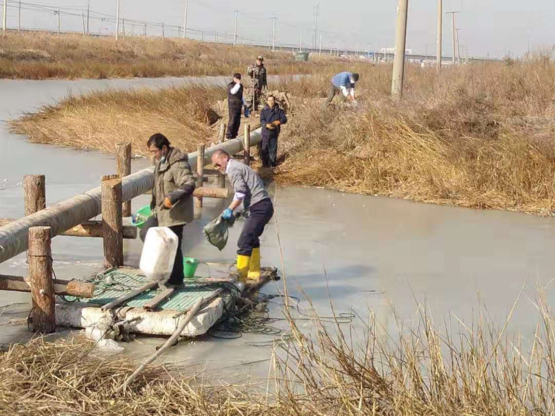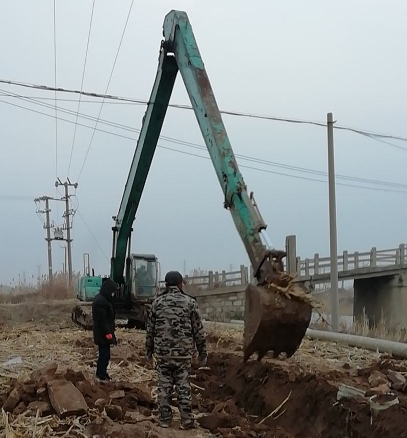 難!難!難!有困難才具有挑戰(zhàn),在“四拼”前一切困難皆為“紙老虎”,大家及時將壓力變?yōu)閯恿?。確定方案后,立即分頭行動,一切工作按部就班,購買8米木樁,河岸邊專人指揮長臂挖掘機機械打樁,頭頂高壓線與通信線路相互交織,現(xiàn)場安全員全過程監(jiān)督指揮保障施工安全距離緊張施工,利用簡易泡沫筏人工敲開河面冰層,劃到河心鉆孔安裝木橫擔,人工開挖河對岸管道,切割吊取管道,打磨涂覆,一切都在有條不紊的進行中??紤]到玻璃鋼管道的易碎性,不敢使用挖掘機吊裝,只能全人工小心翼翼的一小段一小段的輕抬慢放,慢慢挪到門型橫擔上緩緩過河,捆綁固定,最后是對口纏裹涂覆回填竣工。