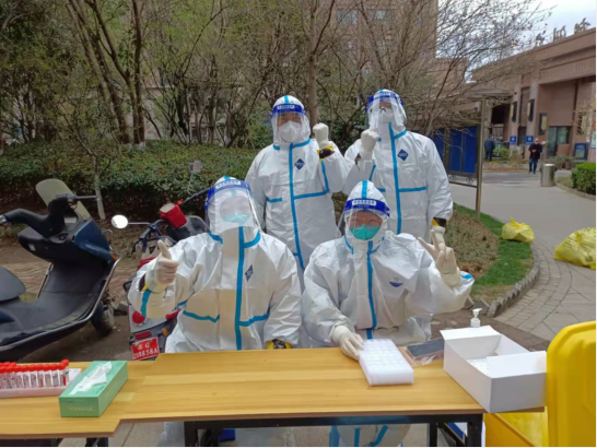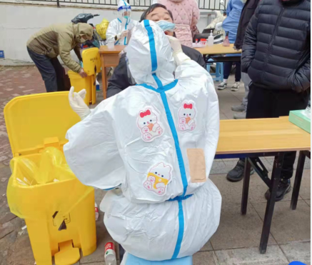 ? ? 12日? 7點集合,領裝備,鑒于昨天的教訓,早上沒喝水,吃了兩口飯,要不大白服就浪費了。出了點意外,排小區(qū)把我們小區(qū)給忘了,沒醫(yī)生來支援,就三個醫(yī)生,三個點,三張臺,隊伍排的那叫一個長。“請大家把健康碼打開,保持一米距離,戴好口罩!”這是我上午說的最多的幾句話。咱們贛榆的醫(yī)生非常辛苦,累了一上午,下午還要采黃碼,掃樓,向他們致敬!中午剛領盒飯就通知徐州支援的醫(yī)生到了,來了十幾個,扒拉兩口飯,開始穿裝備。第七輪結束,感覺人都廢了,渾身濕透,嗓子疼,不想動!