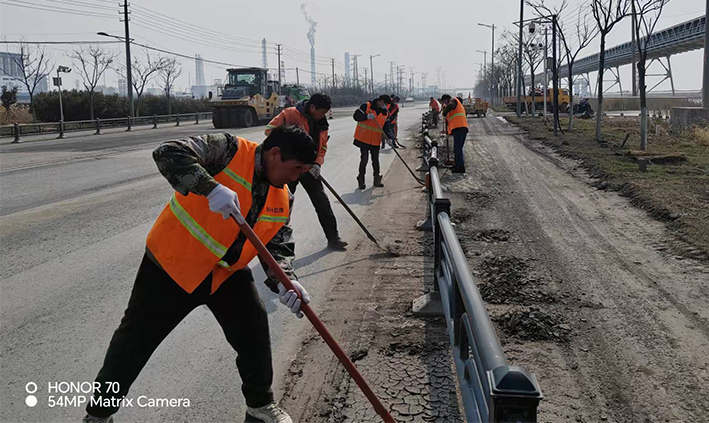315日,該分公司近15余名黨員突擊隊(duì)員,在黨支部號(hào)召下,無(wú)視春光照曬、三人一組、兩個(gè)一對(duì)、揮動(dòng)手中鐵銑,無(wú)懼泥土揚(yáng)塵四起,清除蘇海路,港前卡口護(hù)欄下車輛拋灑泥土2000多米長(zhǎng),人工清掃護(hù)欄內(nèi)石子30多處,車輛轉(zhuǎn)運(yùn)20多車。黨員陳小軍、陳海彬等同志盡管手磨破了,仍然堅(jiān)守道路最前沿,經(jīng)過(guò)30余名隊(duì)員兩天持續(xù)奮戰(zhàn),整潔靚麗的路面再次展現(xiàn)石化園區(qū)。