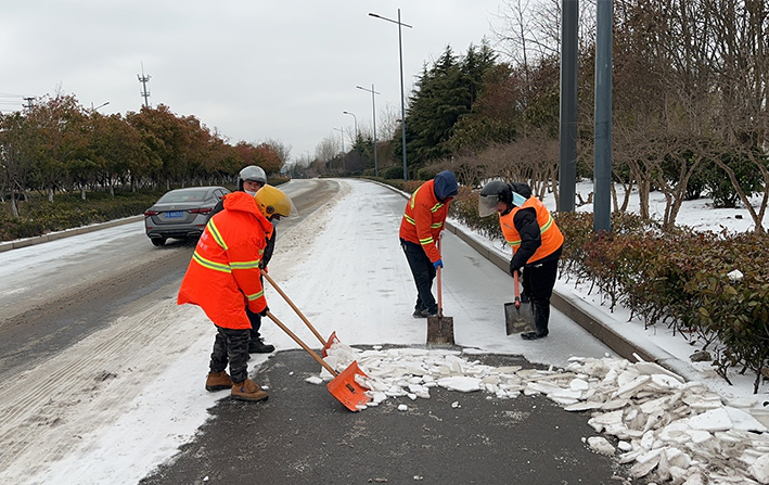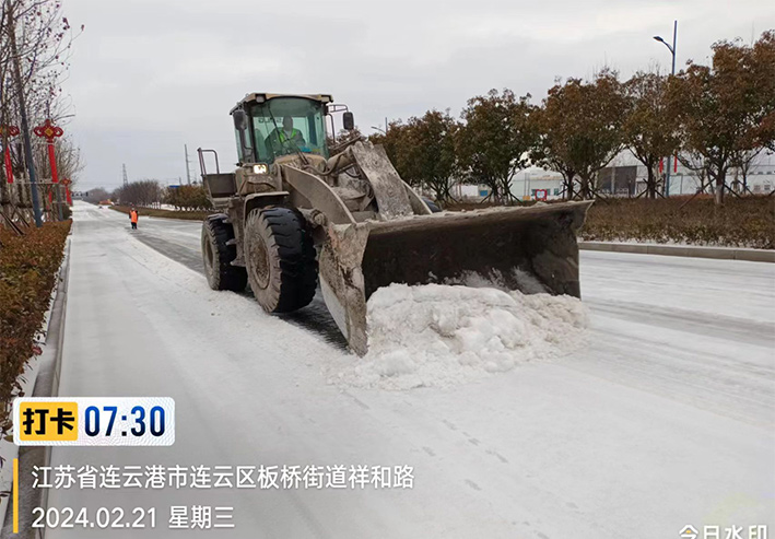 雪花紛飛,寒風(fēng)凜冽,板橋工業(yè)園區(qū)內(nèi),除雪車、雪輥車等機械設(shè)備齊上陣,采取機械化與人工除雪相結(jié)合的方式,雪鍬、掃帚齊上陣,大家你鏟我除、干勁十足,以最快的速度清除板橋園區(qū)云港路、祥和路、瑞和路等交叉路口、重要地段冰凍積雪。