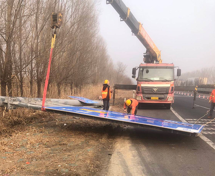 1月12上午,市政道路養(yǎng)護人員在巡查中發(fā)現(xiàn),S242交叉路口北側(cè)交通標示牌存在重大交通安全風險,經(jīng)查看,發(fā)現(xiàn)標志牌基座螺栓已斷三根。該公司立即組織維修人員到達拆除現(xiàn)場,工作人員在標志牌四周擺放警示標志,設置安全作業(yè)區(qū),一名隊員則擔當起臨時交警,引導過往車輛有序通行。因標志牌較大,先期利用機械先將其固定住,隨后工作人員對基座和標志牌進行拆除分解,整個過程分工明確,準備充分,經(jīng)過近2個小時的緊張施工,迅速完成拆除工作。10時許,工作人員并對附近另一塊大型交通標志牌進行扶正并進行加固。此次拆除行動共出動隨車吊機一臺、登高車一臺、工作人員8人次,安全拆除標志牌一塊,扶正、加固標志牌一塊,確保了交通暢通和行車安全。